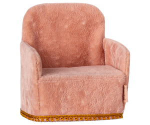 Having just recently furnished a castle set for my two-year-old twin granddaughters, to which my older granddaughter graciously donated the original teal velvet chairs, this oh-so-lovely pink (rose ) chair seemed an appropriate reward for her generosity. As she says - EVERYthing looks better in pink!