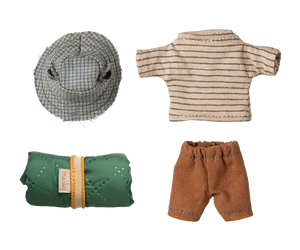 This mouse is well-prepared for a hiking trip in the wild nature. He is dressed for days of walking and brings his sleeping bag for nights under the stars. He has magnets in his hands. Add more accessories from the hiker collection for more play.