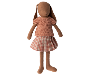 A classic bunny made of soft natural fabrics that gives a lovely hand feel and look. She is dressed up with a skirt and a knitted shirt. Check out our clothes collection to expand the bunny's wardrobe.