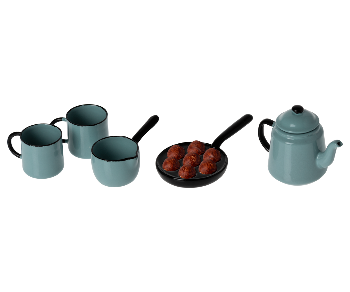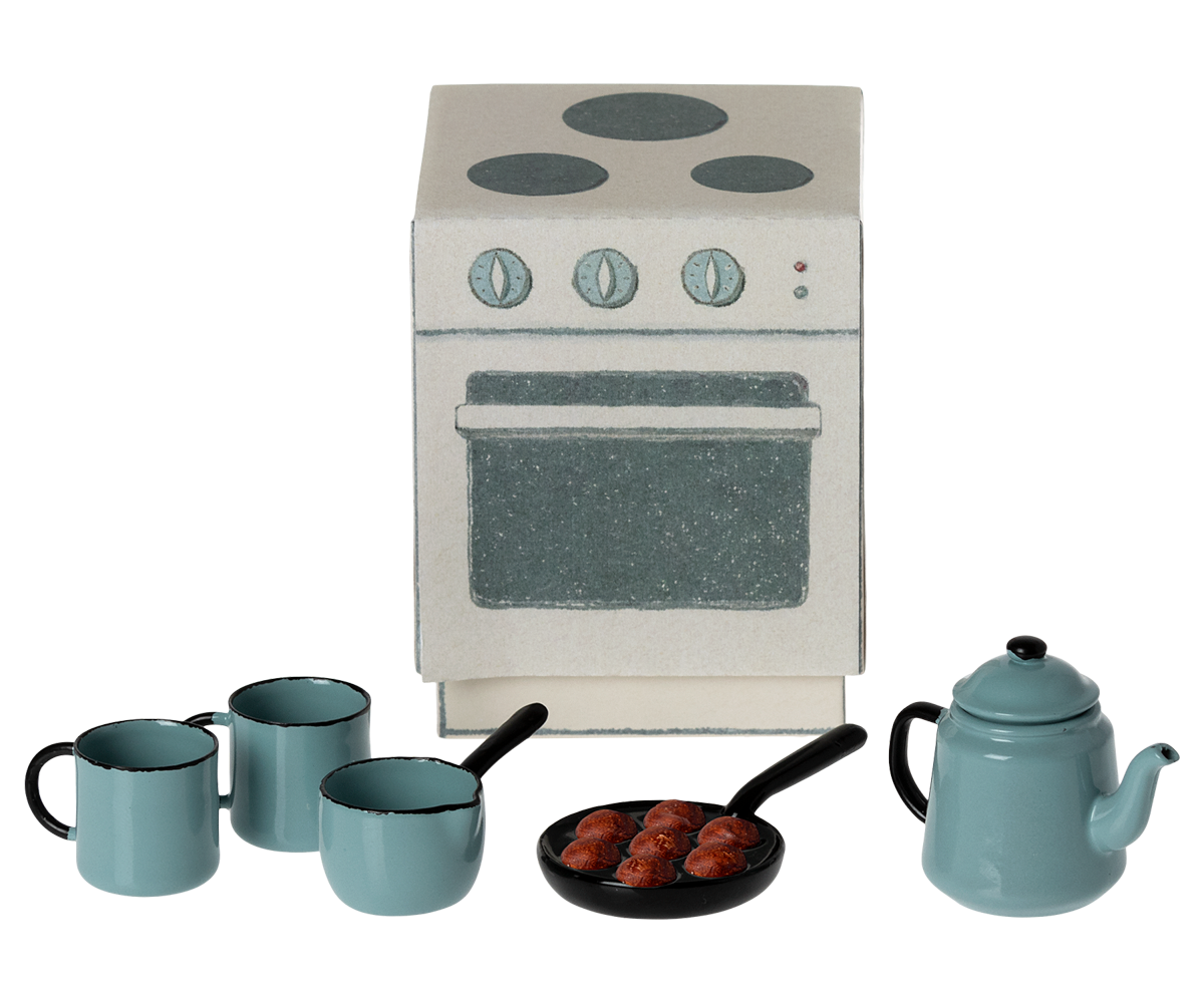Our Madam Blue's Favorites set includes a sweet pot and two cups, a saucepan and a pan with delicious puff cakes - which are a traditional Scandinavian treat in the winter time. All these parts come in a sturdy paper box that looks like a stove and opens up. This set is the perfect size for our Mouse family.