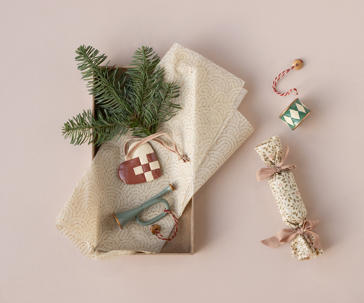 Decorate your home and Christmas tree with metal ornaments. They have beautiful handpainted details. Mix all the different Maileg ornaments to create a personal collection. The trumpet comes in a small giftbox.