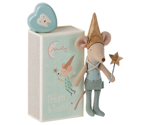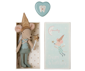 At night the tooth fairy spreads fairy dust, collects teeth, brings treats, and makes sure you have sweet dreams. Dressed magically in soft tones and with a shiny hat and a sparkly backpack, our friend also has a tooth box and a matchbox to rest.