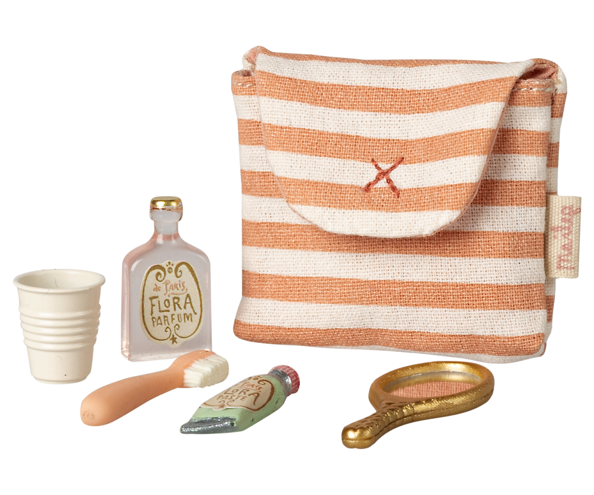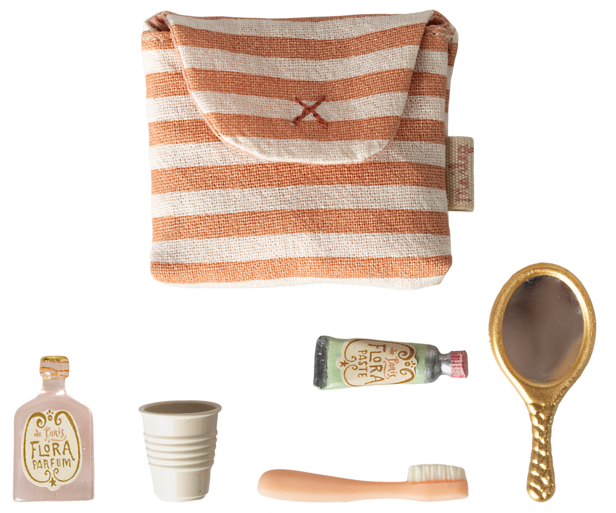 A small bag full of everything you need for the everyday routine before bedtime. A toothbrush, cup, mirror, cream and a parfume bottle will for sure set the perfect playscene for many stories to be told about the mouse family.