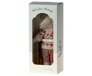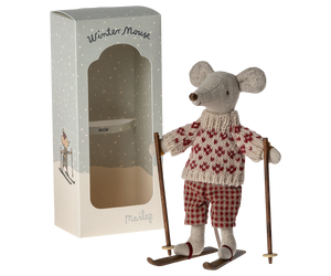 A mouse ready for hours of fun on the slopes during the cold wintertime. Each playset contains a warmly dressed mouse with a pair of ski and poles. A funny detail is the ears which are made so they look like the mouse is wearing ear warmers.