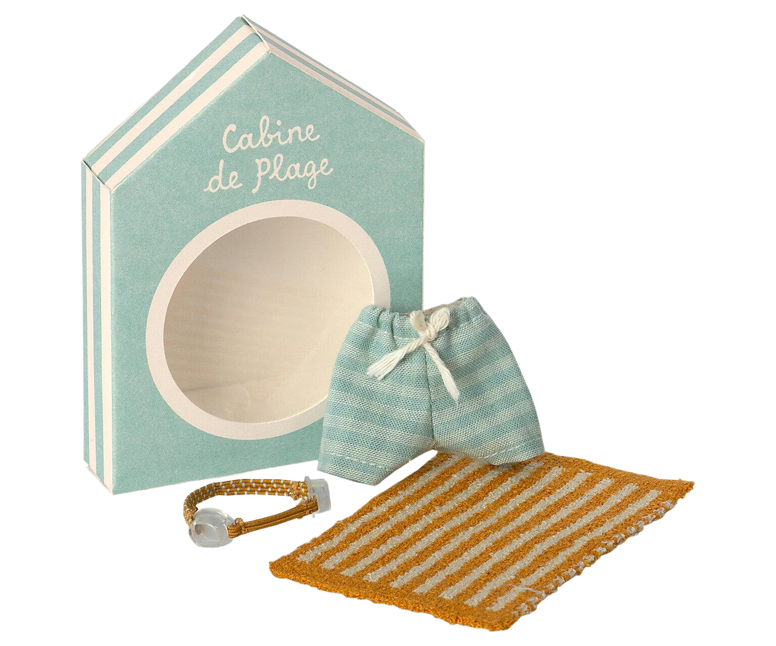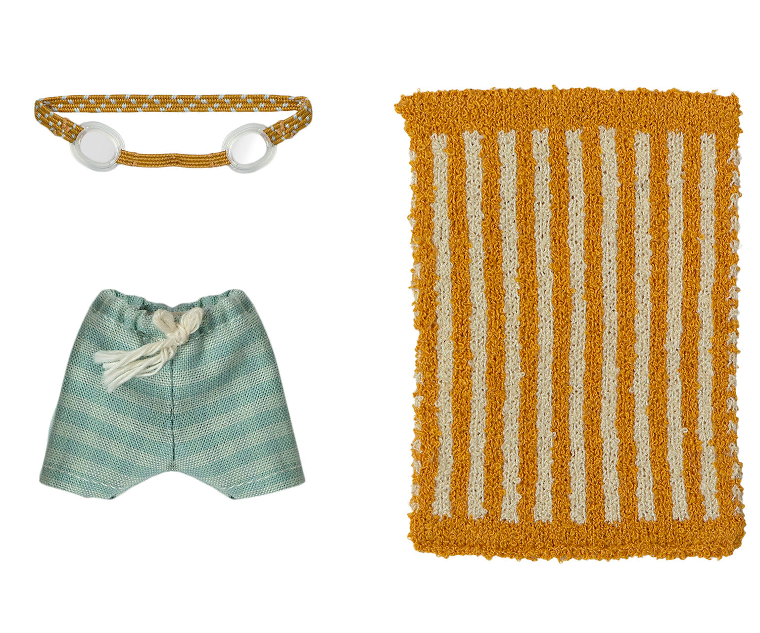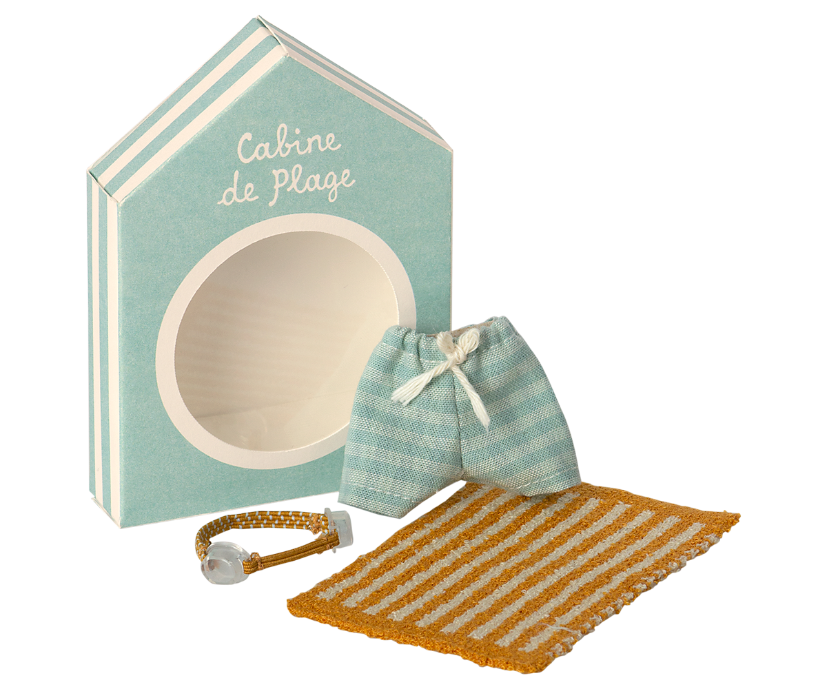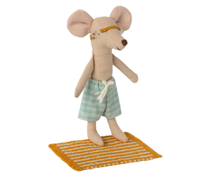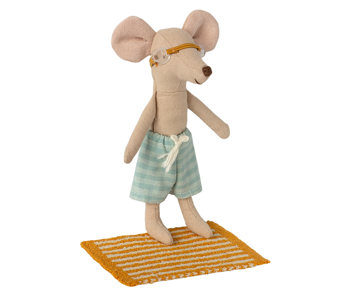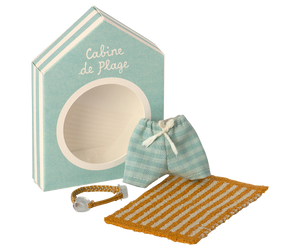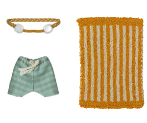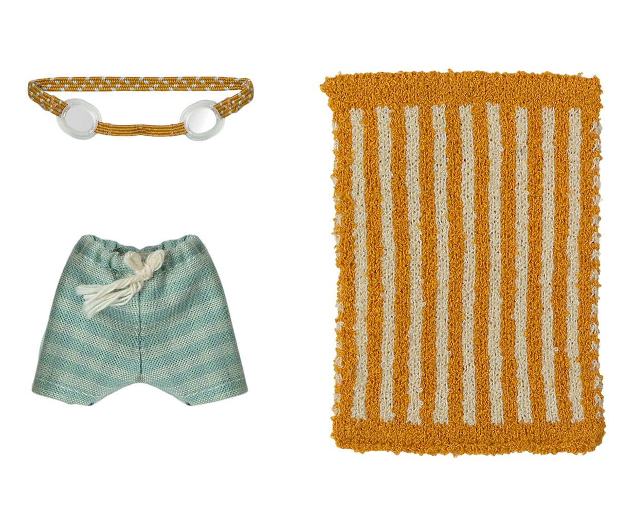 This beach set has everything Big Brother Mouse needs for a day in the sun. It includes striped swim trunks, a pair of goggles and a soft beach towel. These are all the essentials for seaside fun and imaginative play.