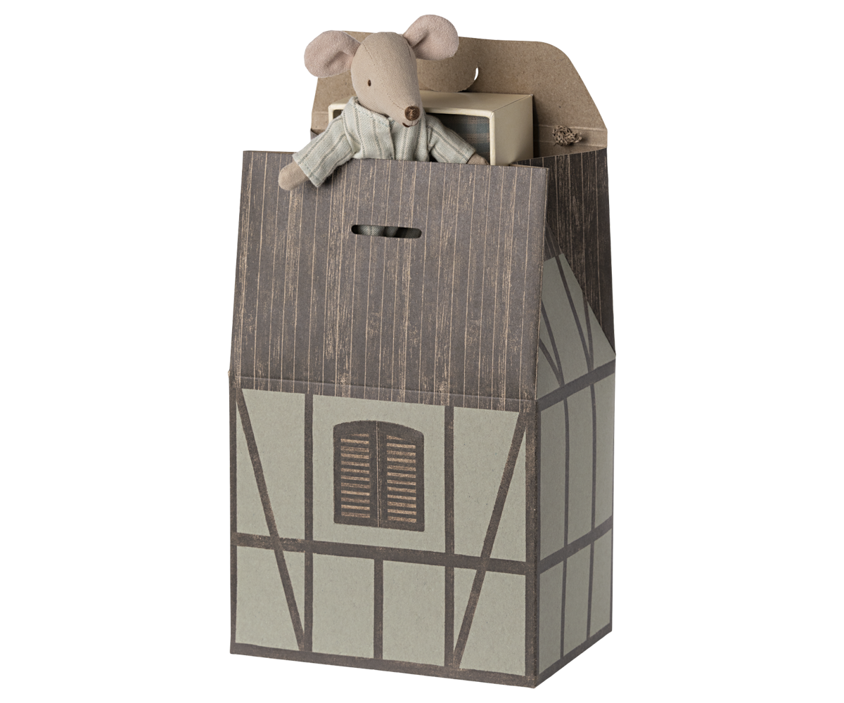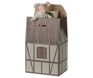 A paper bag shaped like a small house with a door and window. This is the perfect giftwrap for any small Maileg gift and will ensure the story will start before the gift is opened.