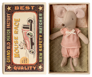 A classic Maileg item, this mouse is ready for hours of play and sleeps soundly in its little matchbox. The clothes and bedding are made of soft fabrics with unique prints in beautiful colors. The mouse has magnets in its hands.