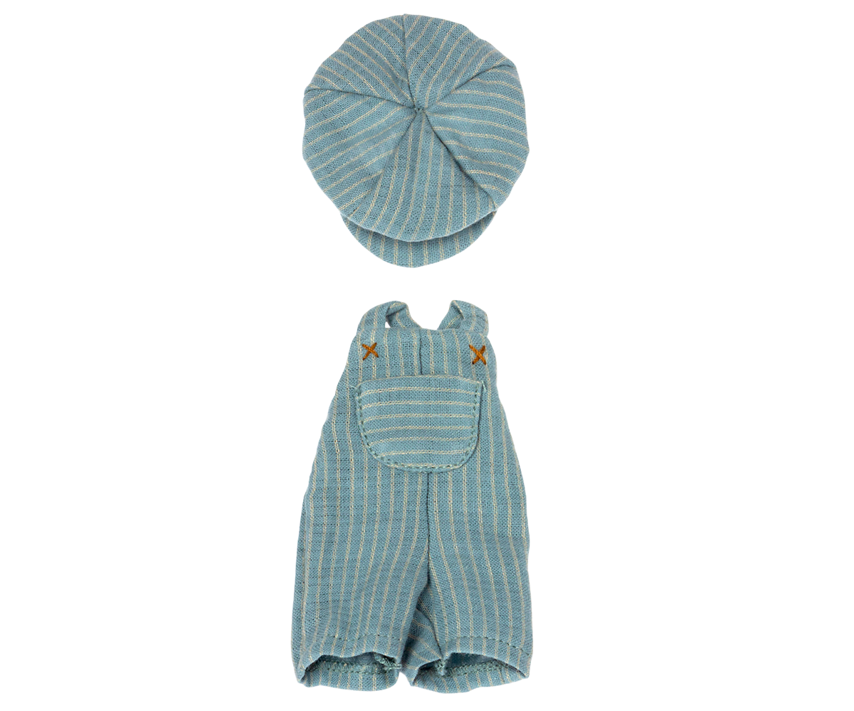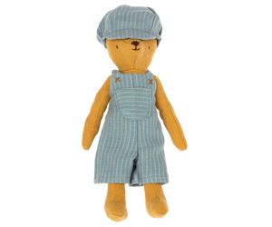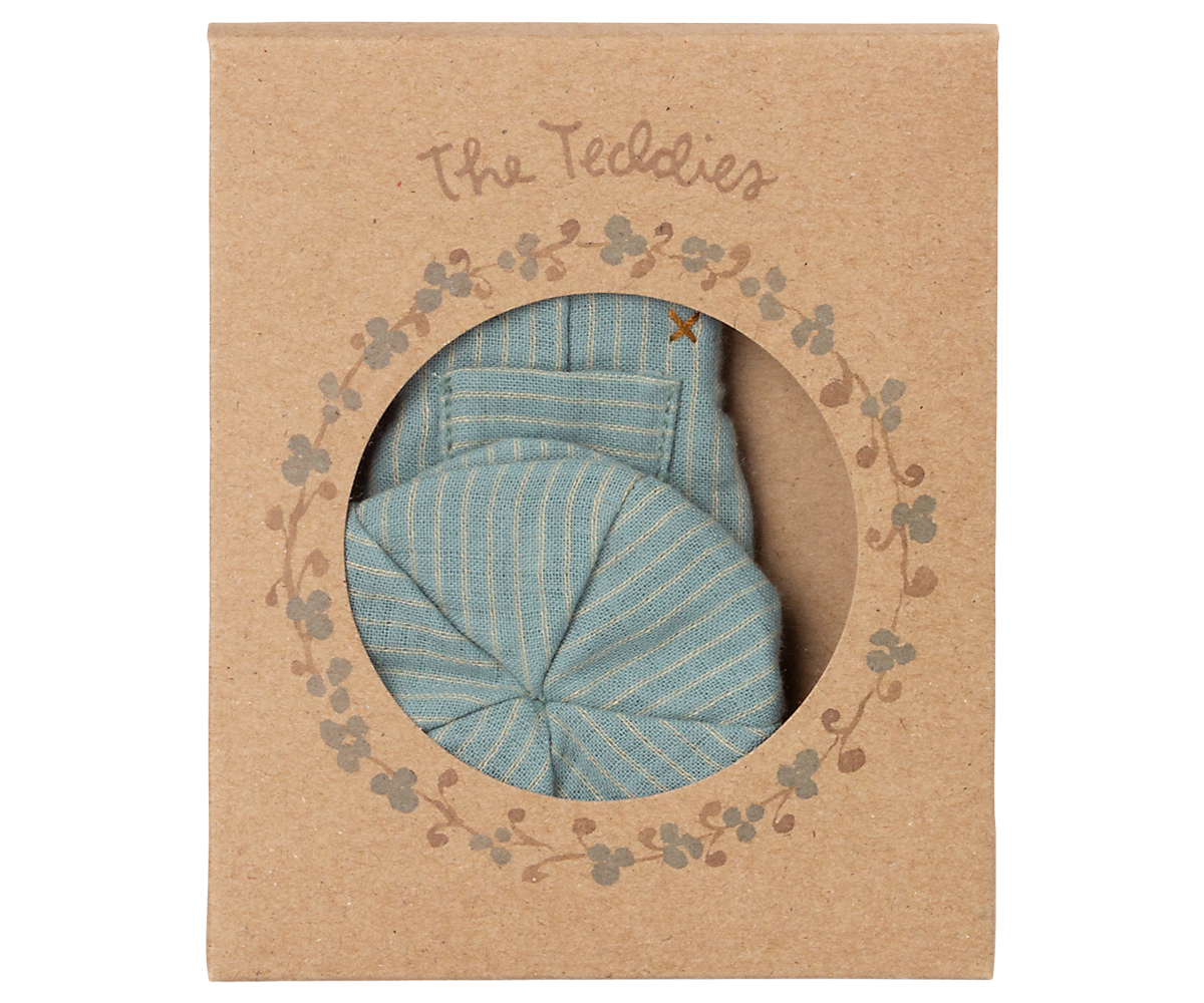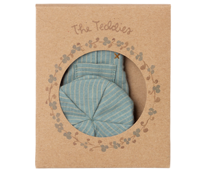 Keep Teddy Junior stylish and ready for adventure with this cosy clothing set. It includes soft, striped overalls with a front pocket and a matching hat.